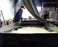 「しぼりにはヤブタと槽を使っています。」一段高いところに備えつけられた槽の大きさ、塊感、重厚さに圧倒される。 |