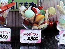 食べたことはないですが(^^; カレーライスあり、サンドウィッチありの豊富なメニューの中にあって特に目を惹くのはこれ、ジャンボパフェ〜っ!見る度に値段が上がって、果物率があがっているような気がしますが、イベンターな君には外せないアイテムでしょう(笑)場を盛り上げるためには食わざるをえません。食って食って食いまくれ(笑)